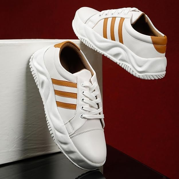 Trendy Dual-Tone Design: Modern white & tan sneakers with sporty stripes that add a stylish edge to your outfit.