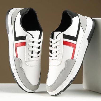 Men’s Casual Sneakers | Stylish Lace-Up Shoes for Men | Premium Synthetic Leather Sneakers | Comfortable Shoes | Trendy White Grey Footwear (Red+Black)