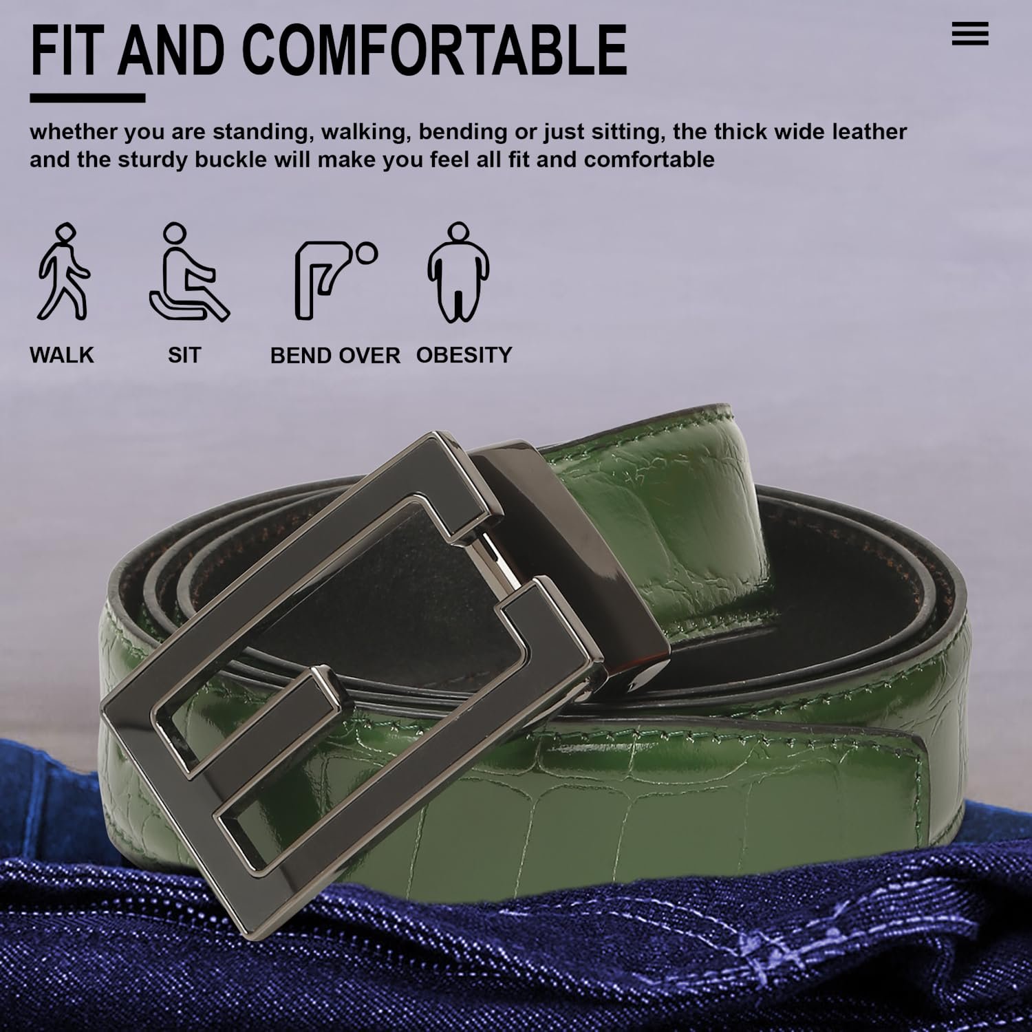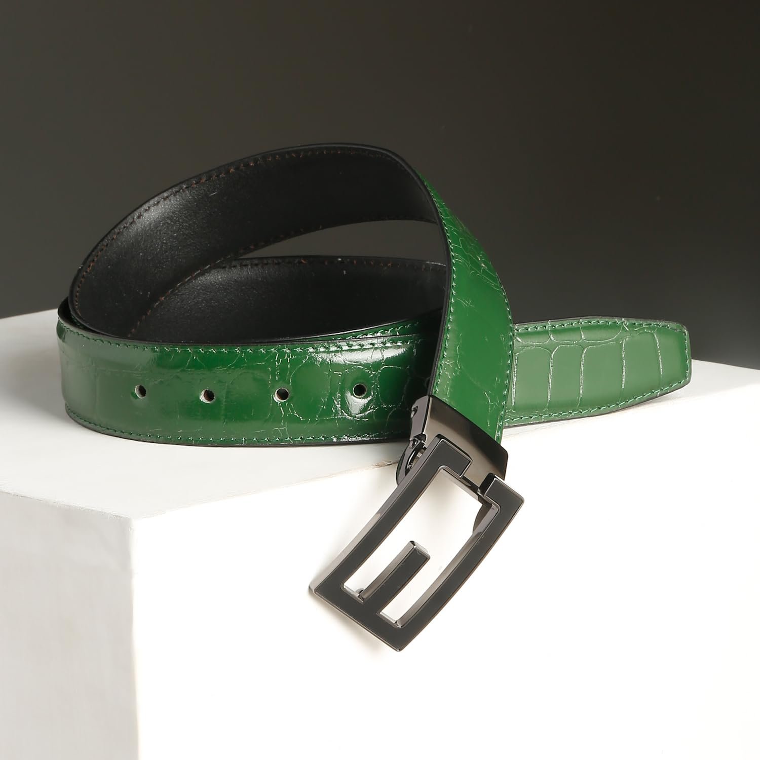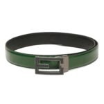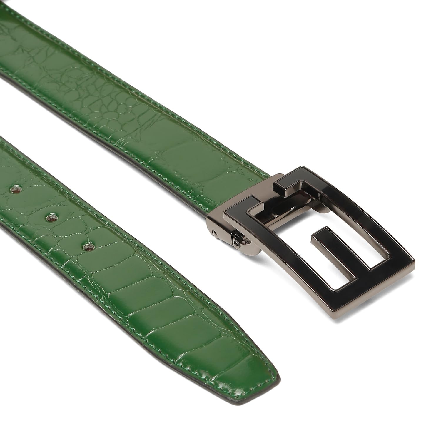 - This genuine leather belt features a unique, crocodile embossed pattern in a striking green, making a bold fashion statement.