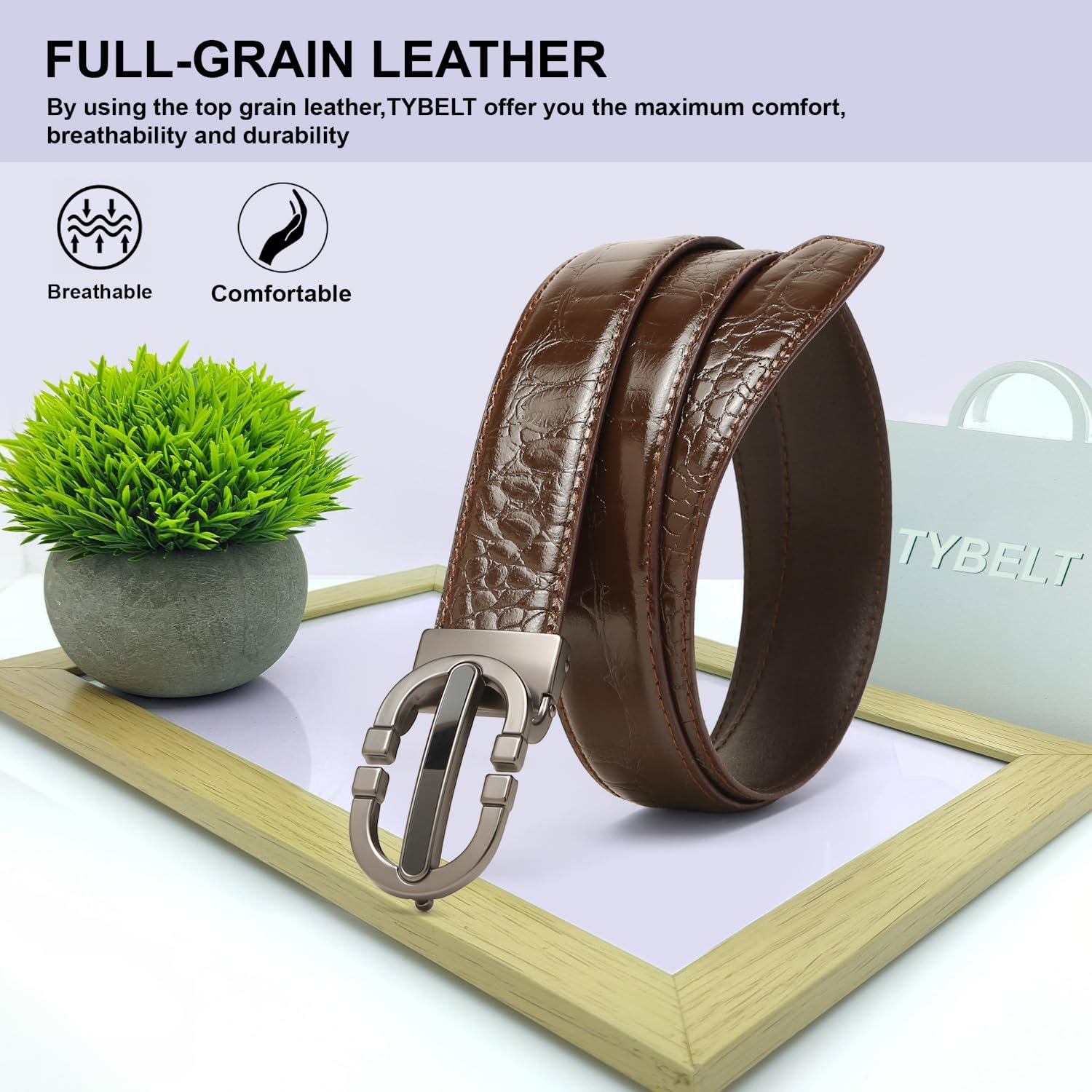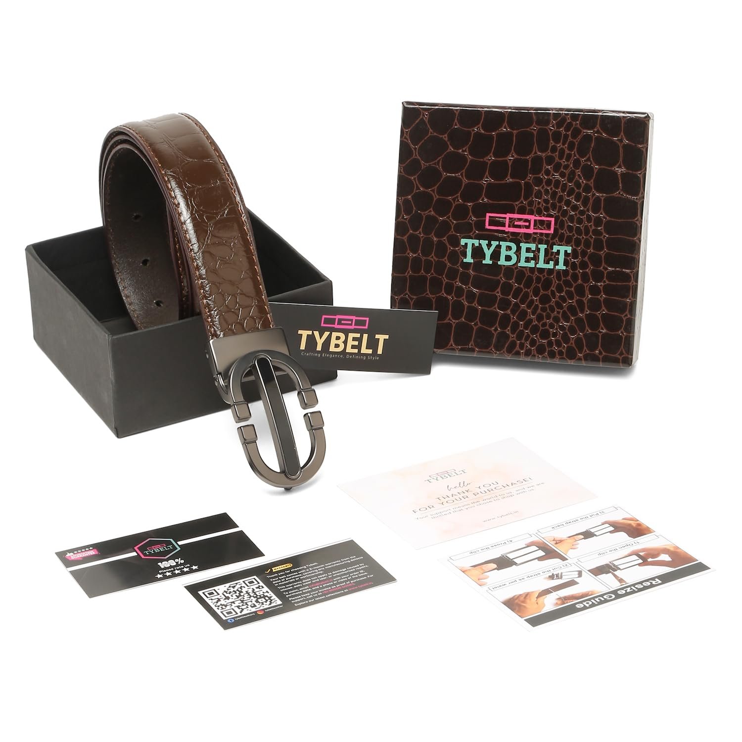 TYBELT Men’s Croc-Embossed Leather Belt – Glossy Brown Designer Belt with Chrome Buckle
